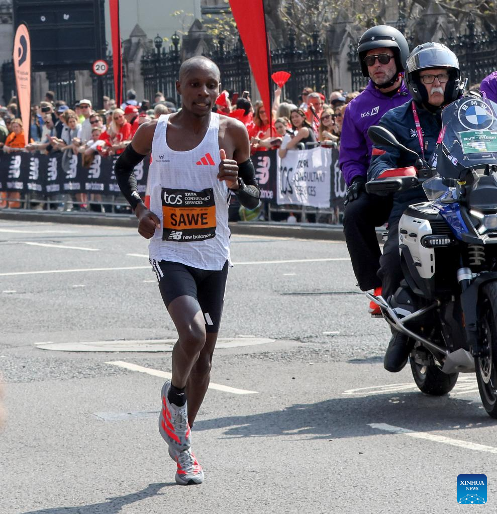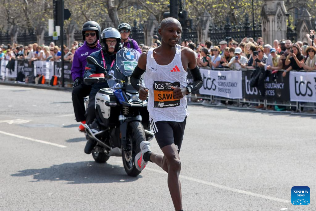 Sabastian Sawe (L) of Kenya runs at the 2025 London Marathon in London, Britain, April 27, 2025. (Xinhua)