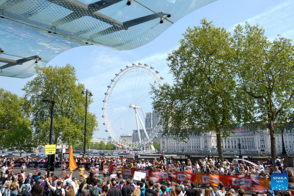 Athletes run past the London Eye at the 2025 London Marathon in London, Britain, April 27, 2025. (Xinhua/Wu Lu)
