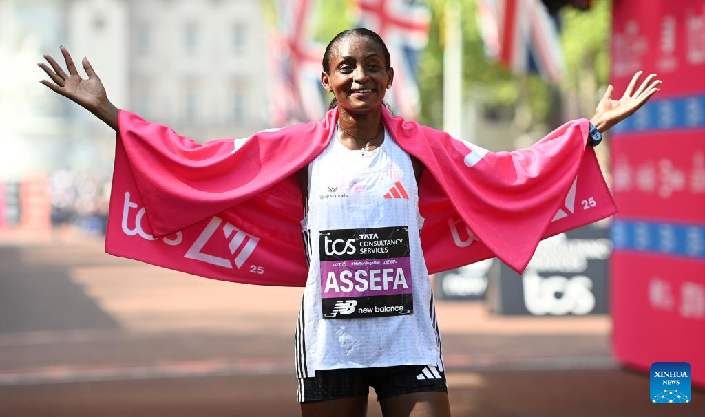 Tigst Assefa of Ethiopia celebrates after winning the women's elite race of the 2025 London Marathon in London, Britain, April 27, 2025. (Xinhua/Jia Yuchen)