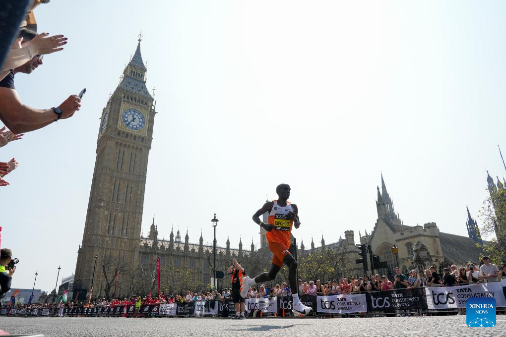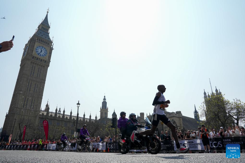 Eliud Kipchoge of Kenya runs past the Big Ben at the 2025 London Marathon in London, Britain, April 27, 2025. (Xinhua/Wu Lu)