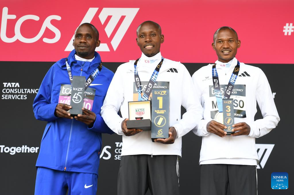 First placed Sabastian Sawe (C) of Kenya, second placed Jacob Kiplimo (L) of Uganda and third placed Alexander Mutiso Munyao of Kenya pose during the awarding ceremony for men's elite race of the 2025 London Marathon in London, Britain, April 27, 2025. (Xinhua/Jia Yuchen)