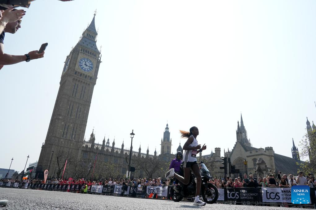 Tigst Assefa of Ethiopia runs past the Big Ben at the 2025 London Marathon in London, Britain, April 27, 2025. (Xinhua/Wu Lu)
