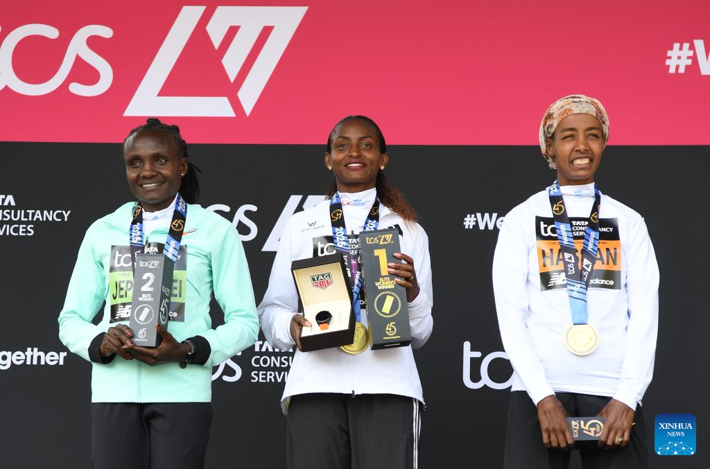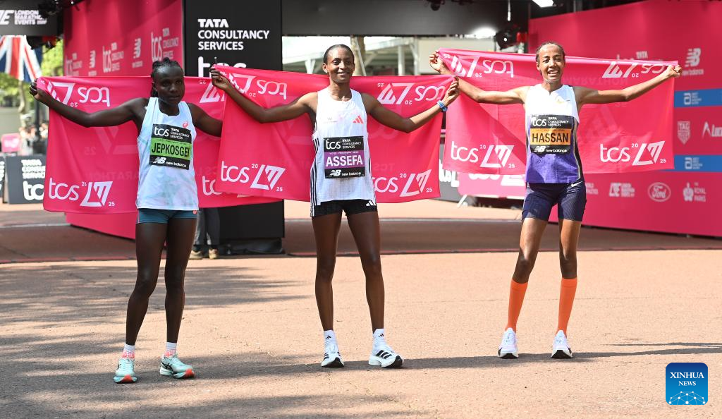 First placed Tigst Assefa (C) of Ethiopia poses with second placed Joyciline Jepkosgei (L) of Kenya and third placed Sifan Hassan of the Netherlands after the women's elite race of the 2025 London Marathon in London, Britain, April 27, 2025. (Xinhua/Jia Yuchen)