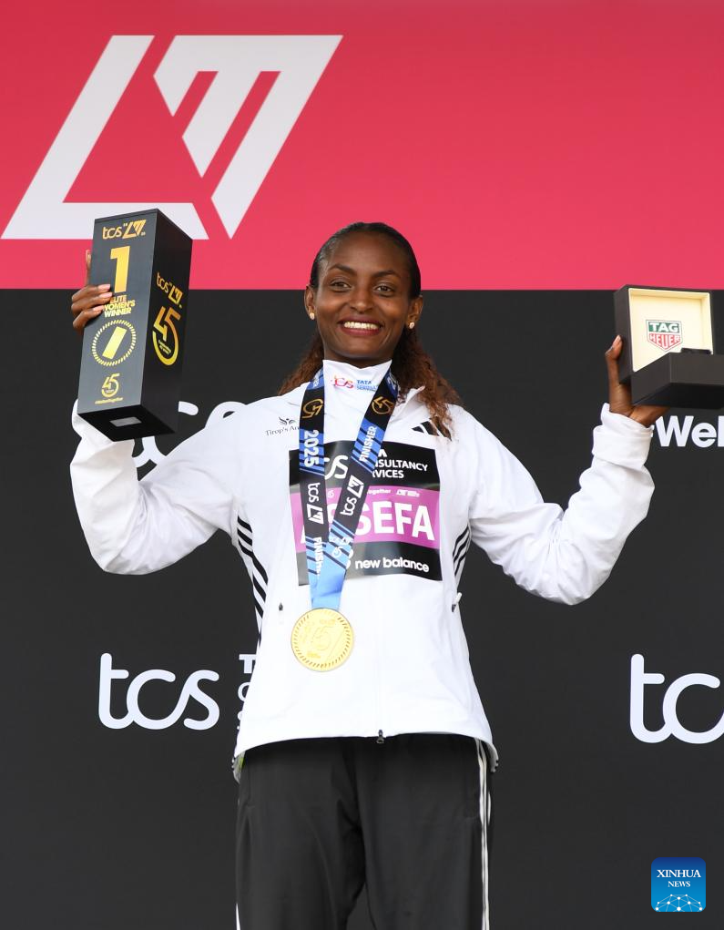 First-placed Tigst Assefa of Ethiopia poses during the awarding ceremony for the women's elite race of the 2025 London Marathon in London, Britain, April 27, 2025. (Xinhua/Jia Yuchen)