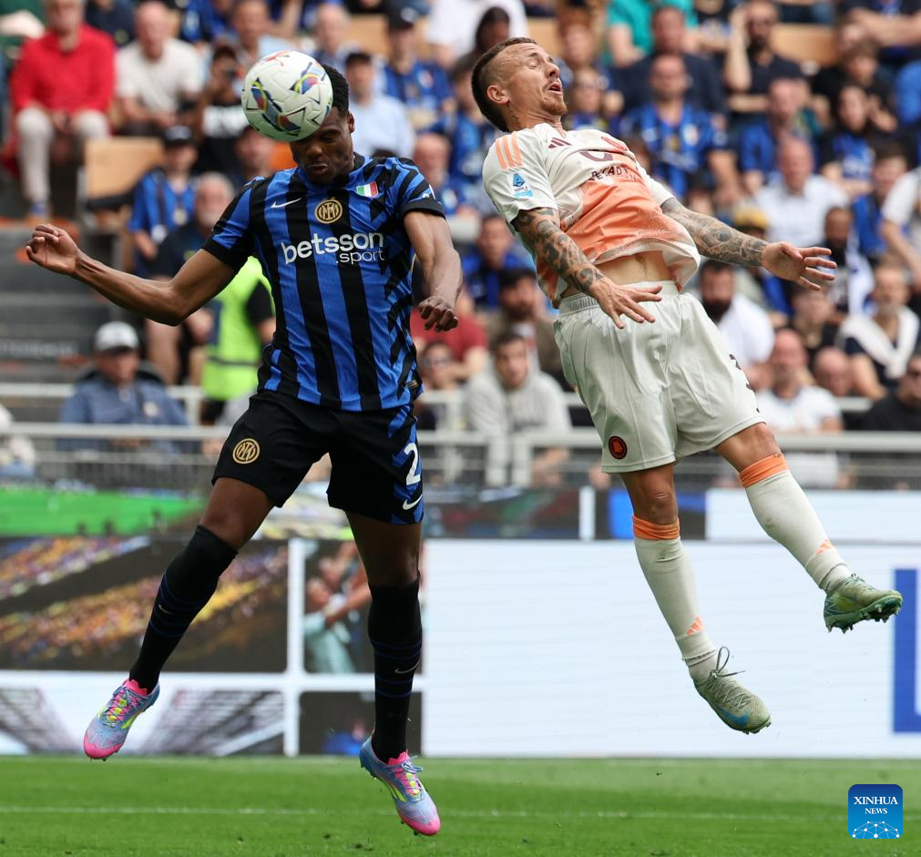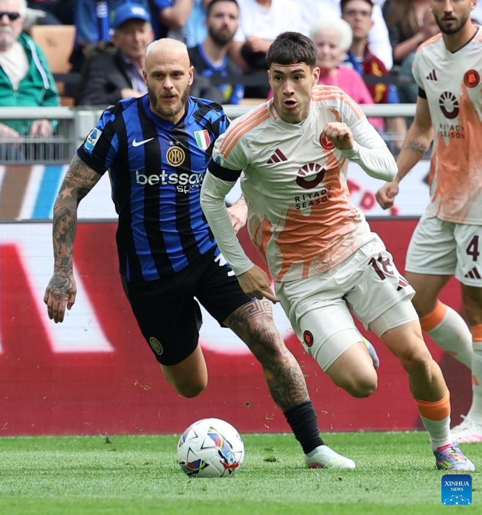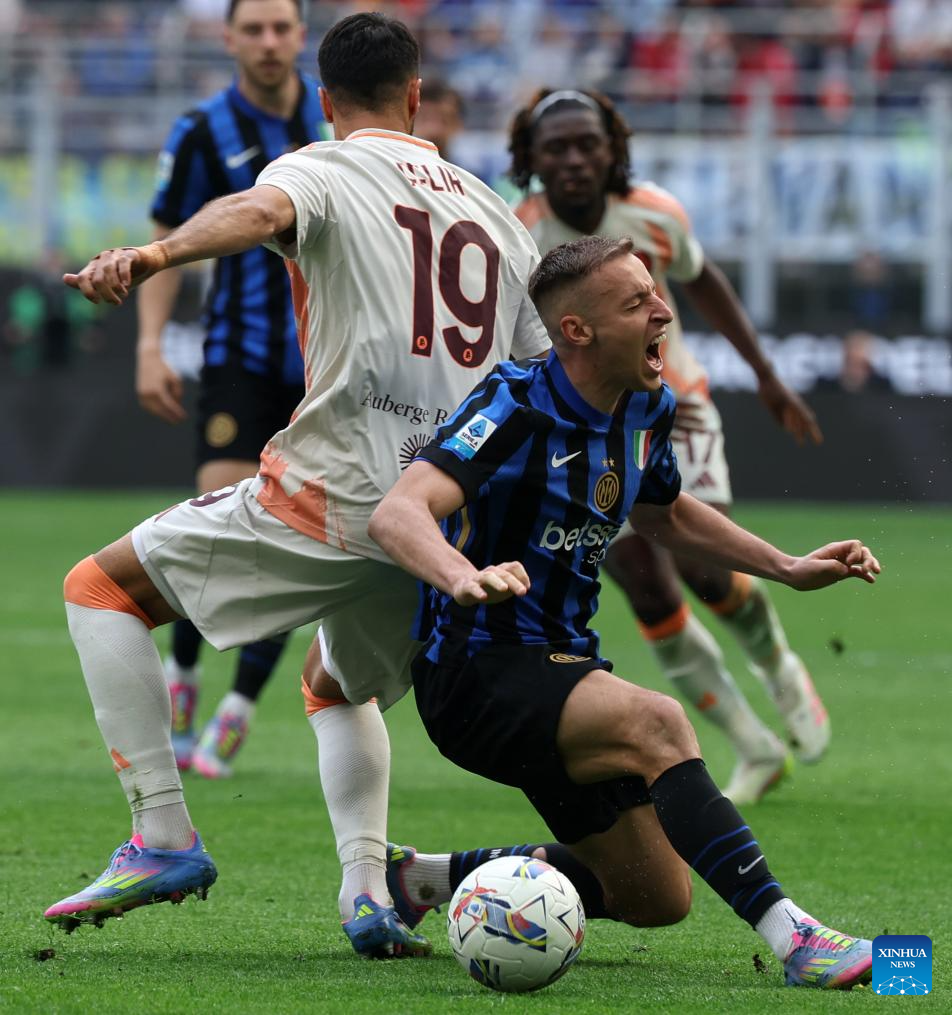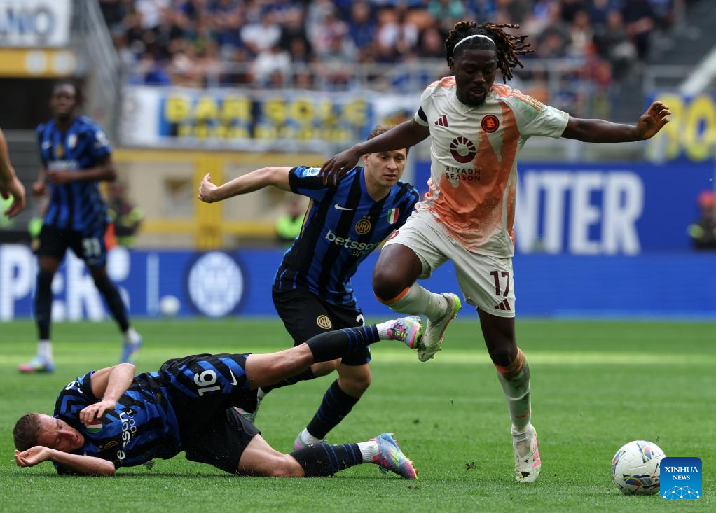 Roma's Zeki Celik (L) vies with Inter Milan's Davide Frattesi during a Serie A soccer match between Inter Milan and Roma in Milan, Italy, April 27, 2025. (Photo by Alberto Lingria/Xinhua)