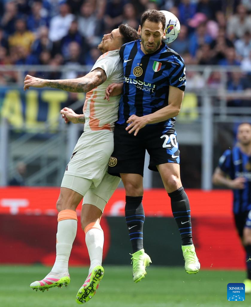 Roma's Lorenzo Pellegrini (L) vies with Inter Milan's Hakan Calhanoglu during a Serie A soccer match between Inter Milan and Roma in Milan, Italy, April 27, 2025. (Photo by Alberto Lingria/Xinhua)