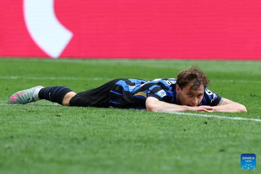 Inter Milan's Nicolo Barella reacts during a Serie A soccer match between Inter Milan and Roma in Milan, Italy, April 27, 2025. (Photo by Alberto Lingria/Xinhua)