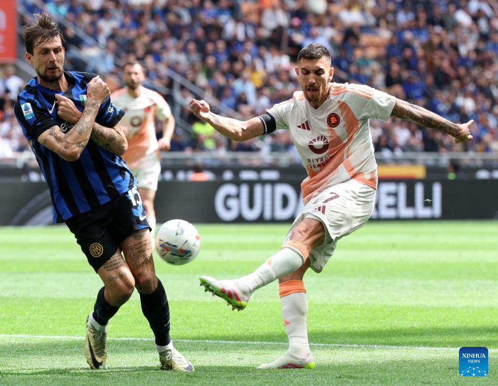 Roma's Lorenzo Pellegrini (R) vies with Inter Milan's Francesco Acerbi during a Serie A soccer match between Inter Milan and Roma in Milan, Italy, April 27, 2025. (Photo by Alberto Lingria/Xinhua)