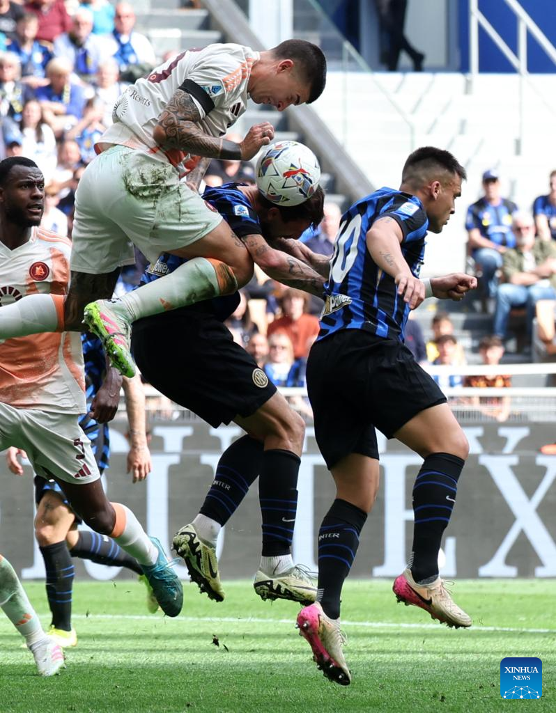 Roma's Gianluca Mancini (Top) vies with Inter Milan's Francesco Acerbi (2nd R) and Lautaro Martinez (1st R) during a Serie A soccer match between Inter Milan and Roma in Milan, Italy, April 27, 2025. (Photo by Alberto Lingria/Xinhua)