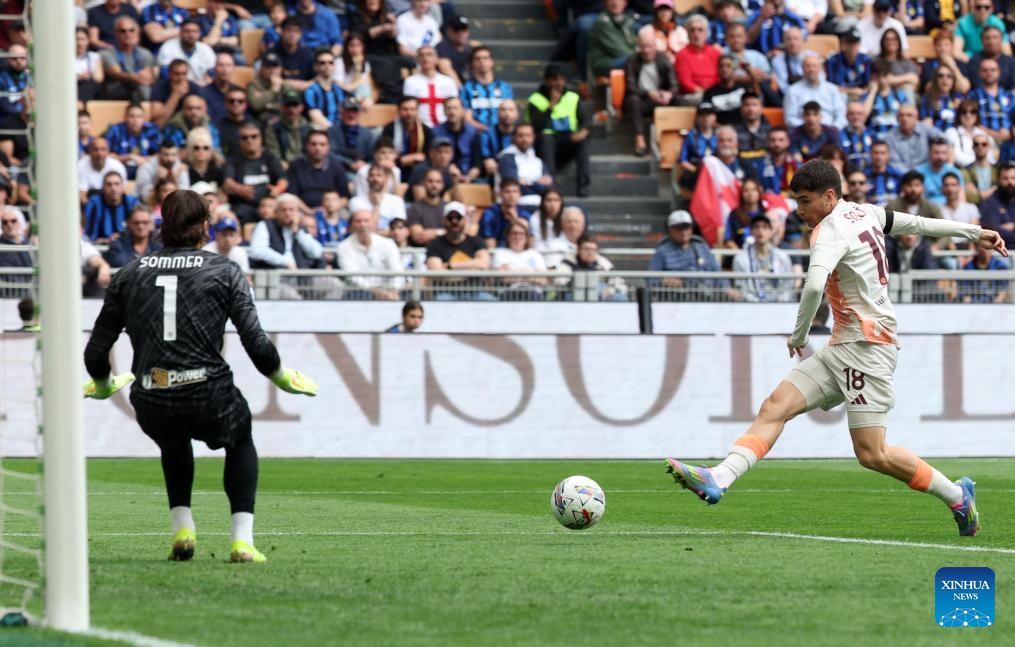 Roma's Matias Soule scores during a Serie A soccer match between Inter Milan and Roma in Milan, Italy, April 27, 2025. (Photo by Alberto Lingria/Xinhua)