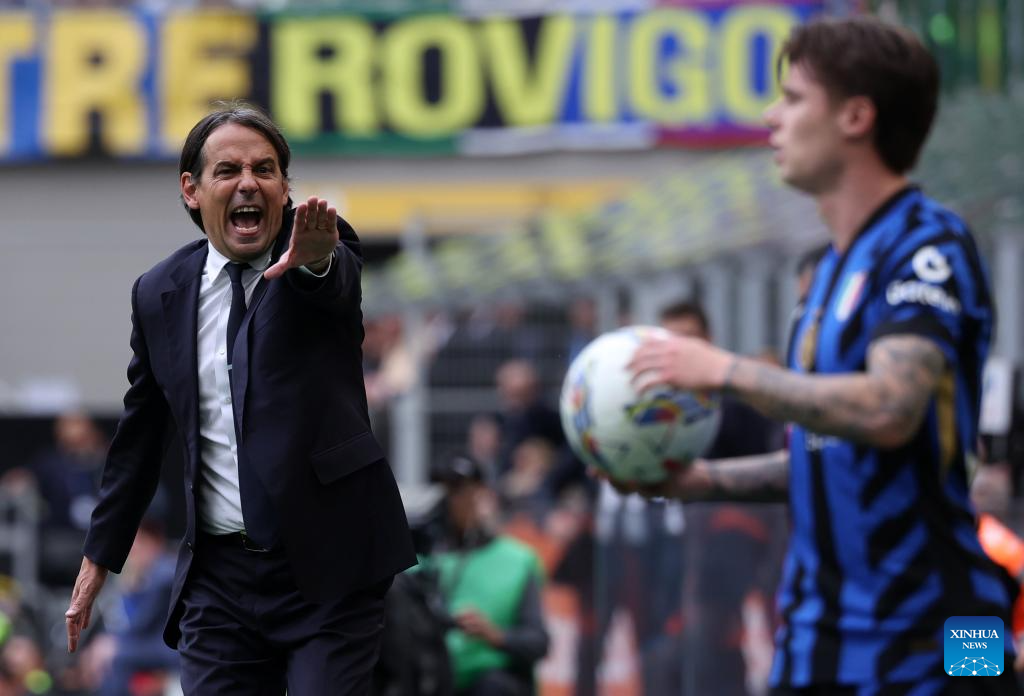 Inter Milan's head coach Simone Inzaghi gestures during a Serie A soccer match between Inter Milan and Roma in Milan, Italy, April 27, 2025. (Photo by Alberto Lingria/Xinhua)