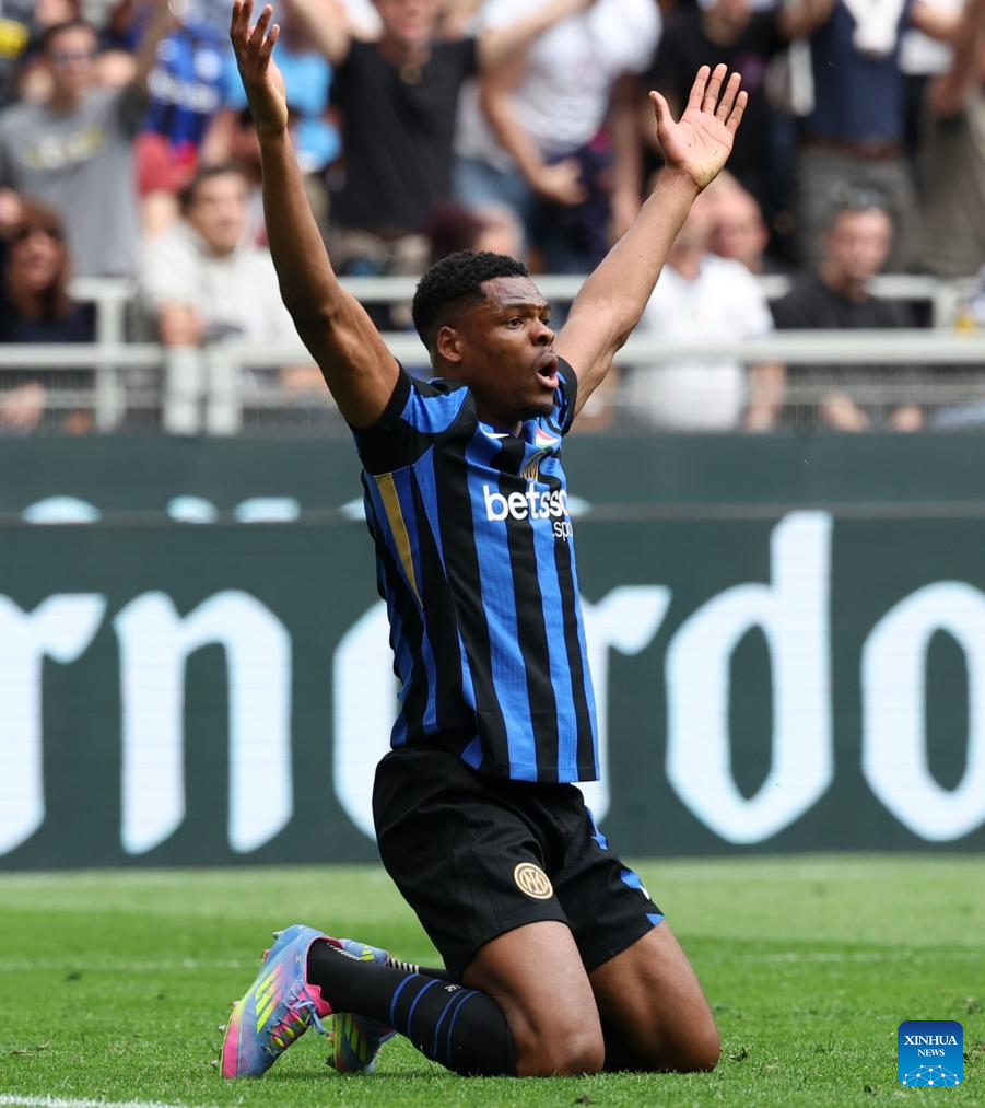 Inter Milan's Denzel Dumfries reacts during a Serie A soccer match between Inter Milan and Roma in Milan, Italy, April 27, 2025. (Photo by Alberto Lingria/Xinhua)