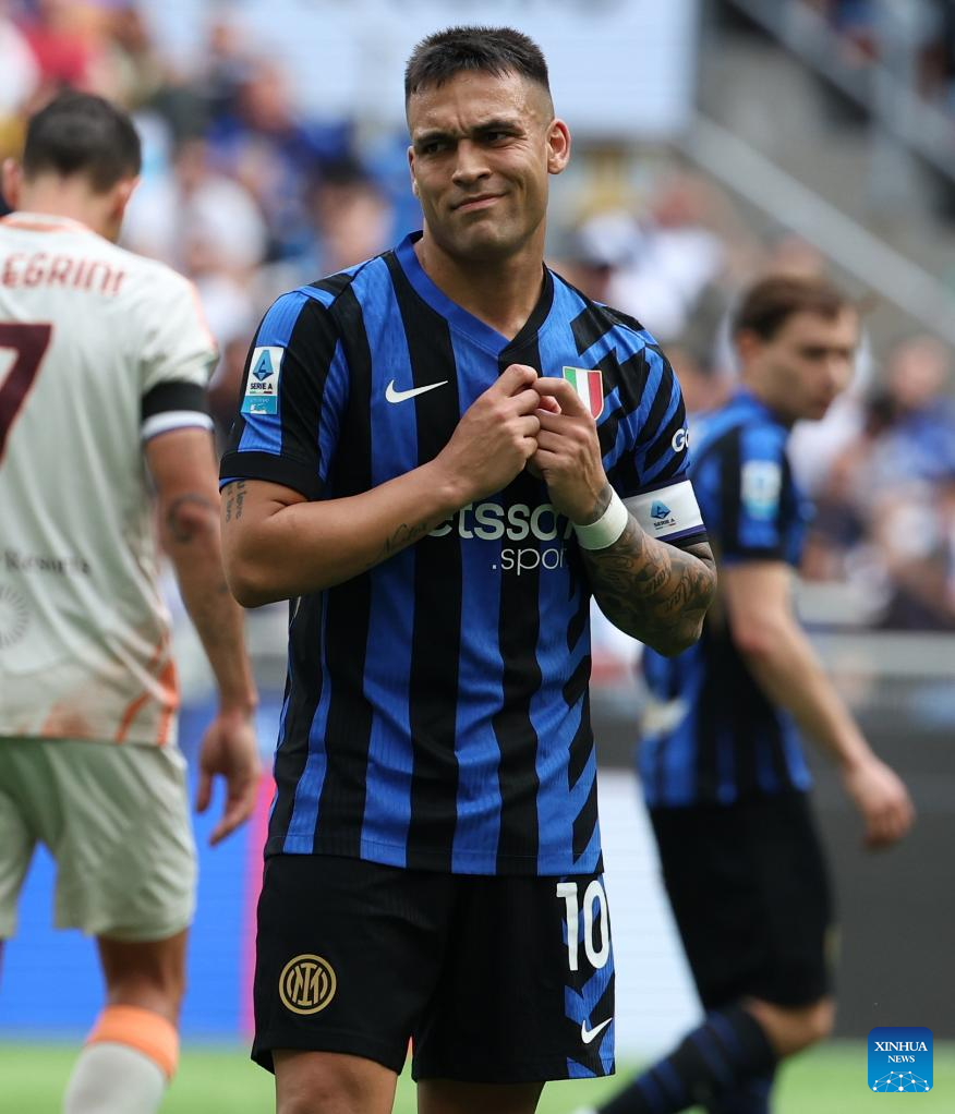 Inter Milan's Lautaro Martinez reacts during a Serie A soccer match between Inter Milan and Roma in Milan, Italy, April 27, 2025. (Photo by Alberto Lingria/Xinhua)