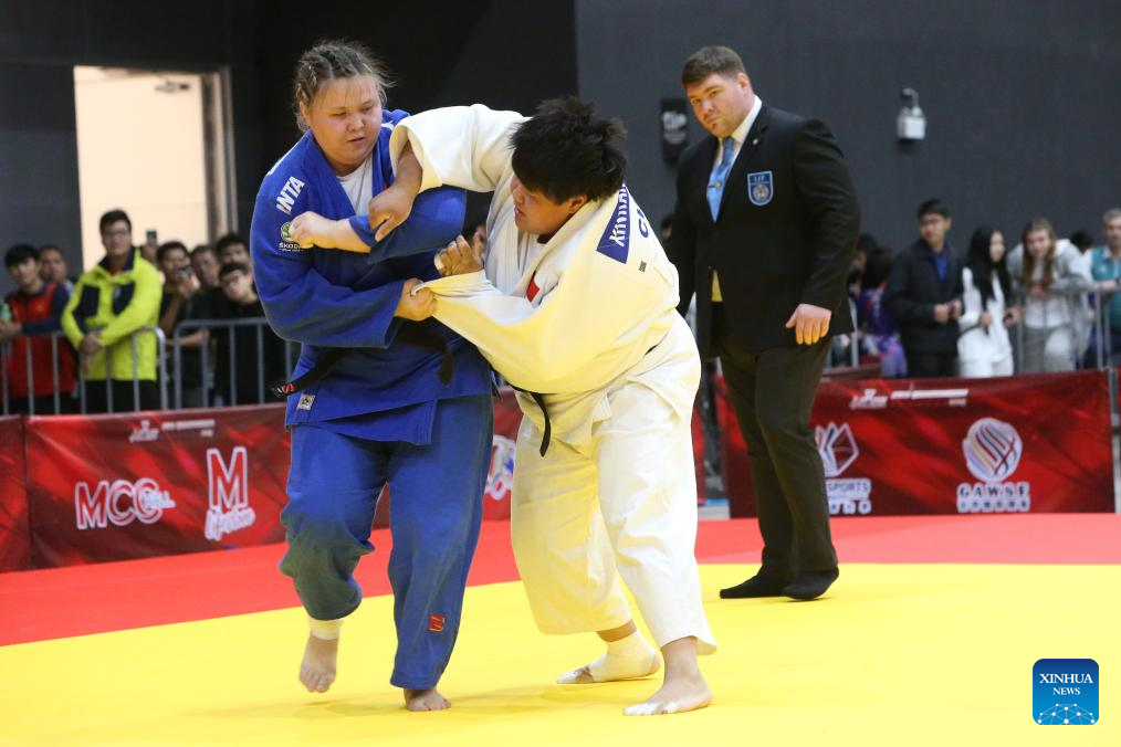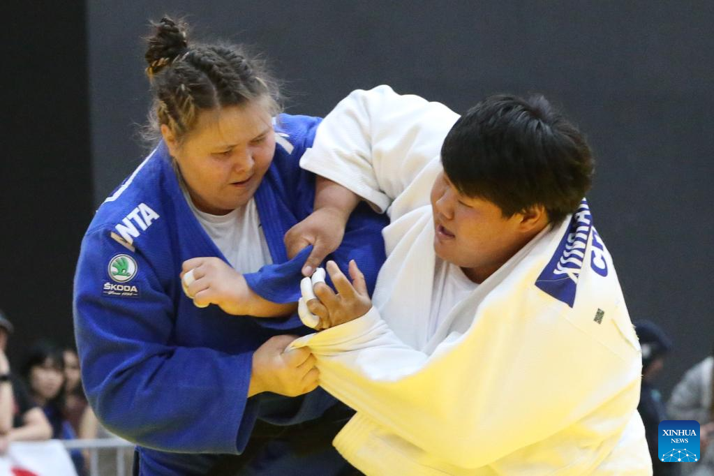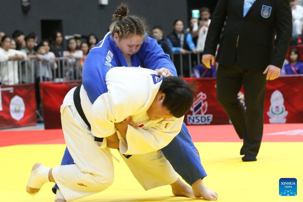 Ayiman Jinesinuer (L) and Niu Xinran of China compete during the women's +78 kg final at the Asian Judo Championships in Bangkok, Thailand, April 27, 2025. (Xinhua/Rachen Sageamsak)