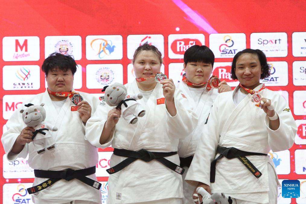 Gold medalist Ayiman Jinesinuer (2nd L) of China, silver medalist Niu Xinran of China (1st L), bronze medalist Lee Hyeonji (2nd R) of South Korea and bronze medalist Adiyasuren Amarsaikhan of Mongolia pose during the awarding ceremony of the women's +78 kg final at the Asian Judo Championships in Bangkok, Thailand, April 27, 2025. (Xinhua/Rachen Sageamsak)