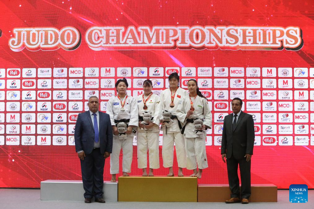 Gold medalist Ikeda Kurena (3rd L) of Japan, silver medalist Kim Minju of South Korea (2nd L), bronze medalist Wu Hongtao (3rd R) of China and bronze medalist Marjona Kuchimova (2nd R) of Uzbekistan pose during the awarding ceremony of the women's -78 kg at the Asian Judo Championships in Bangkok, Thailand, April 27, 2025. (Xinhua/Rachen Sageamsak)