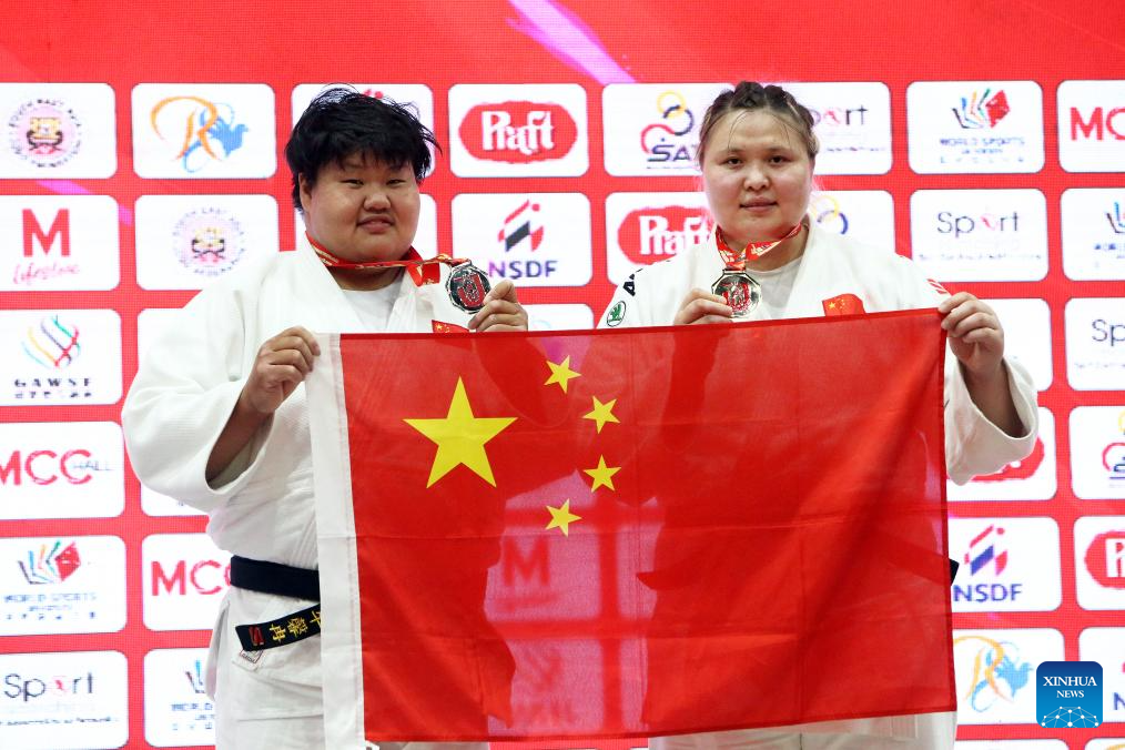 Ayiman Jinesinuer (R) and Niu Xinran of China pose during the awarding ceremony of the women's +78 kg final at the Asian Judo Championships in Bangkok, Thailand, April 27, 2025. (Xinhua/Rachen Sageamsak)