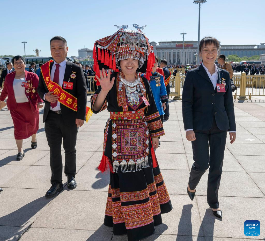 Representatives arrive for a grand gathering to celebrate the 100th anniversary of the founding of the All-China Federation of Trade Unions and honor model workers and exemplary individuals at the Great Hall of the People in Beijing, capital of China, April 28, 2025. (Xinhua/Cai Yang)