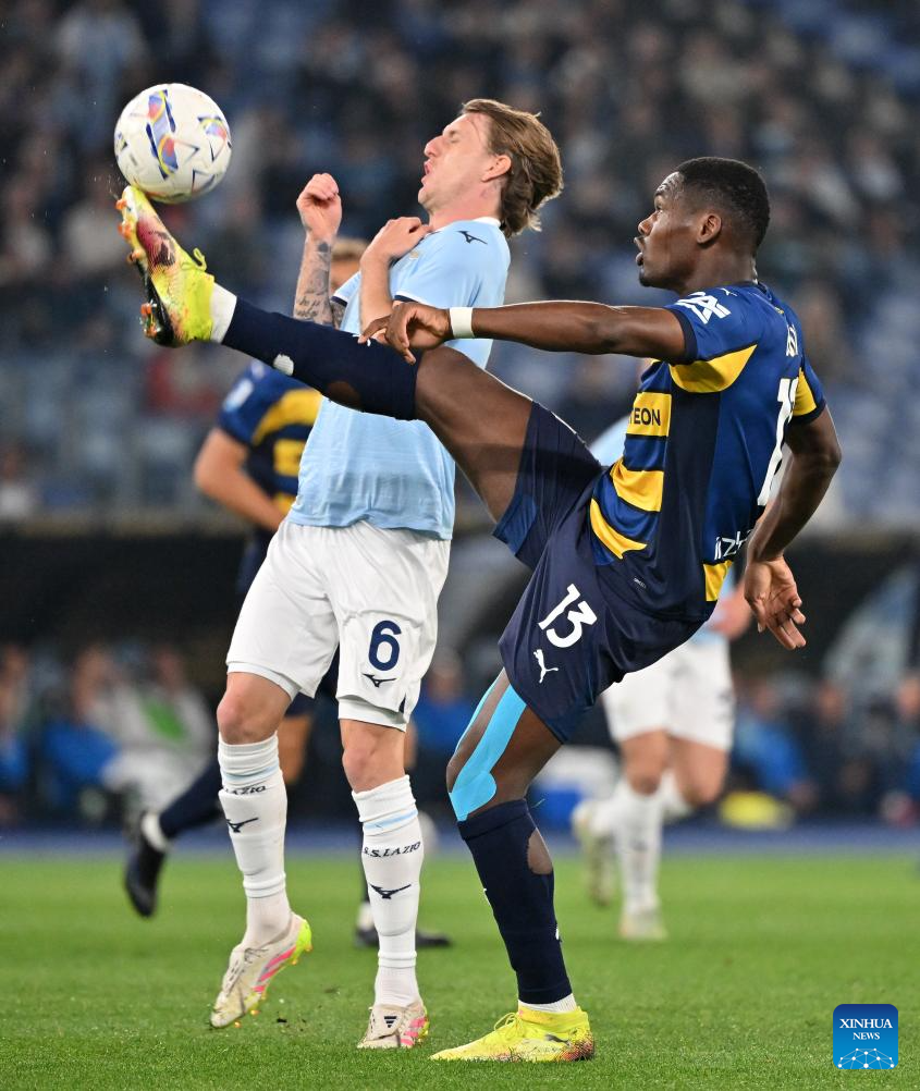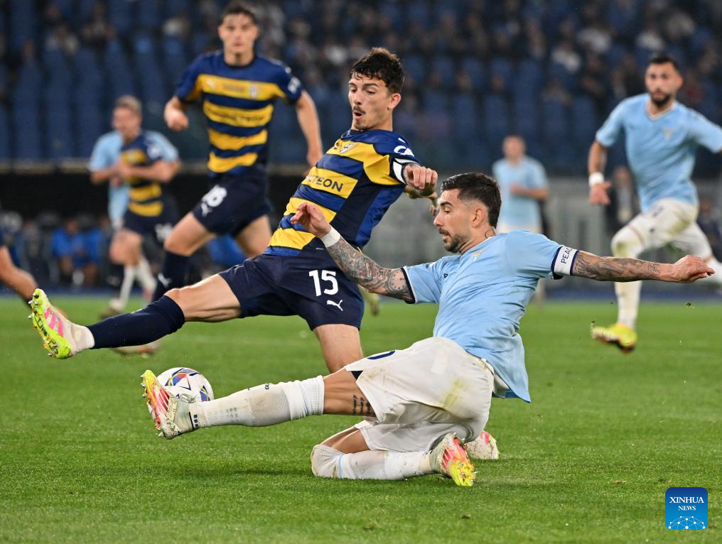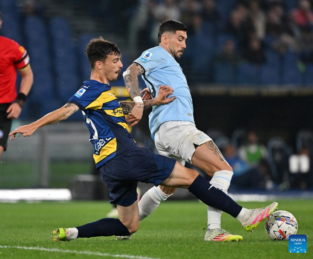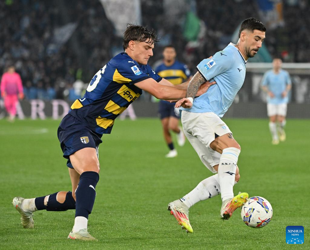 Lazio's Mario Gila (R) vies with Parma's Mateo Pellegrino during a Serie A soccer match between Lazio and Parma in Rome, Italy, April 28, 2025. (Photo by Alberto Lingria/Xinhua)