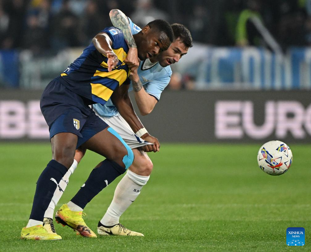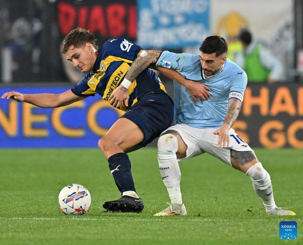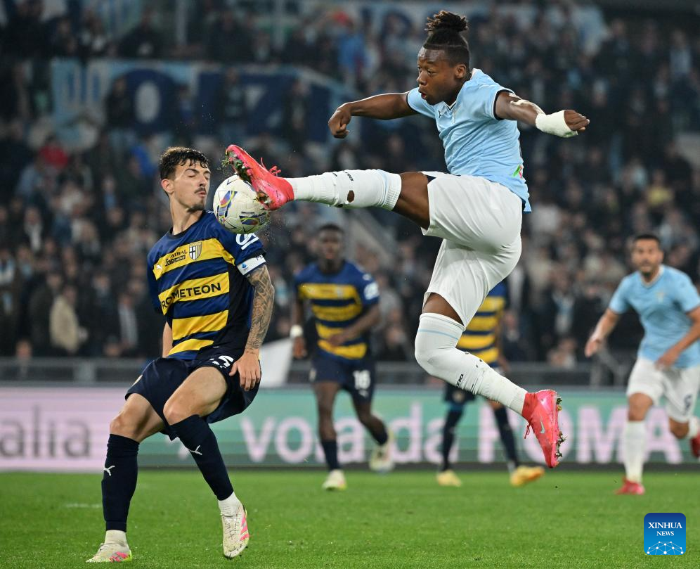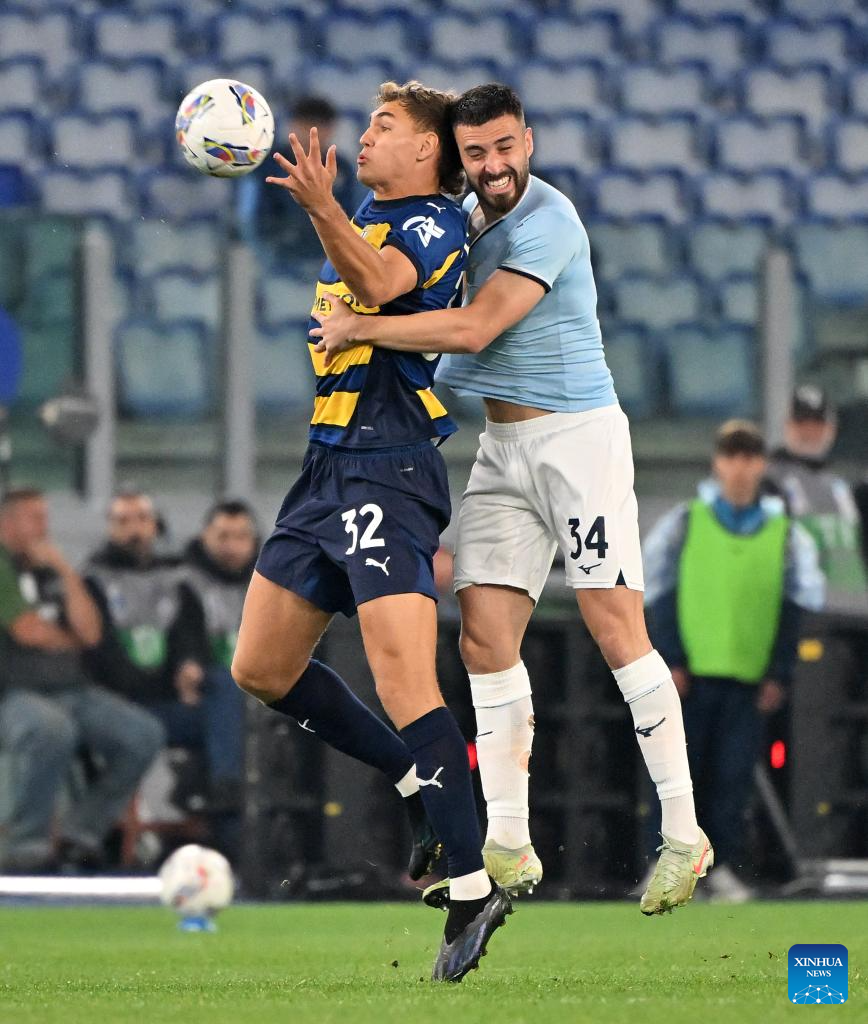 Lazio's Mario Gila (R) vies with Parma's Mateo Pellegrino during a Serie A soccer match between Lazio and Parma in Rome, Italy, April 28, 2025. (Photo by Alberto Lingria/Xinhua)