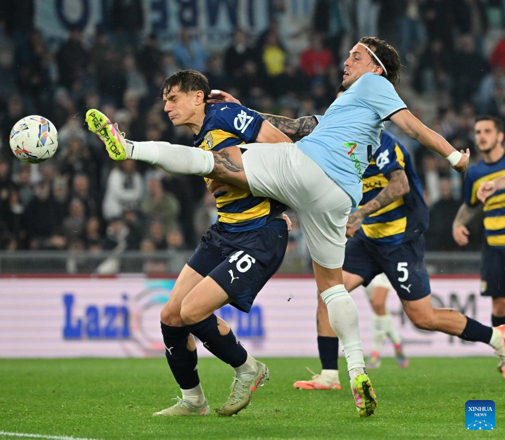 Lazio's Mattia Zaccagni (R) vies with Parma's Giovanni Leoni during a Serie A soccer match between Lazio and Parma in Rome, Italy, April 28, 2025. (Photo by Alberto Lingria/Xinhua)