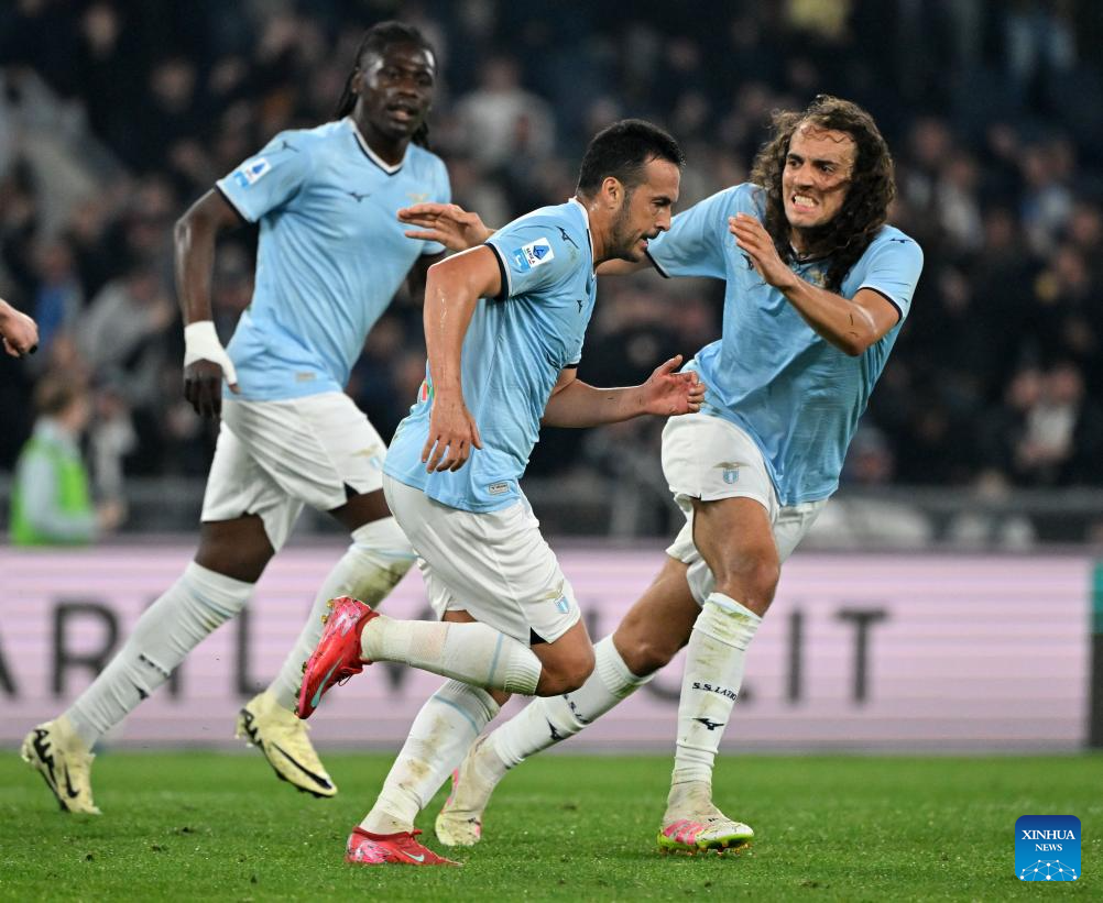 Lazio's Pedro (2nd L) scores his goal during a Serie A soccer match between Lazio and Parma in Rome, Italy, April 28, 2025. (Photo by Alberto Lingria/Xinhua)