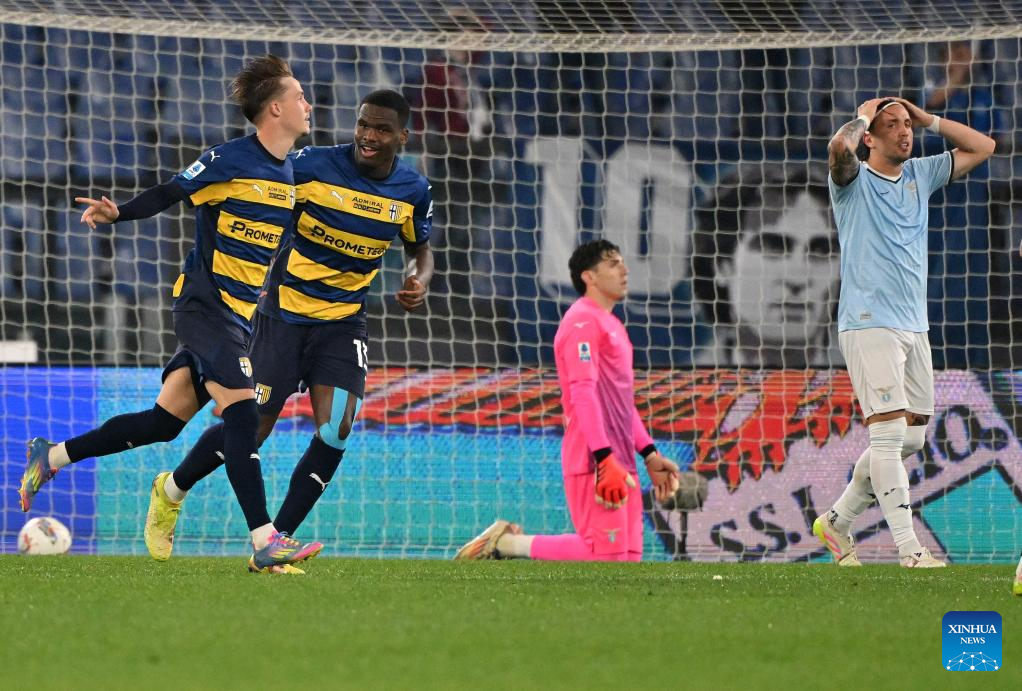 Parma's Jacob Ondrejka (C) celebrates his goal with his teammates during a Serie A soccer match between Lazio and Parma in Rome, Italy, April 28, 2025. (Photo by Alberto Lingria/Xinhua)
