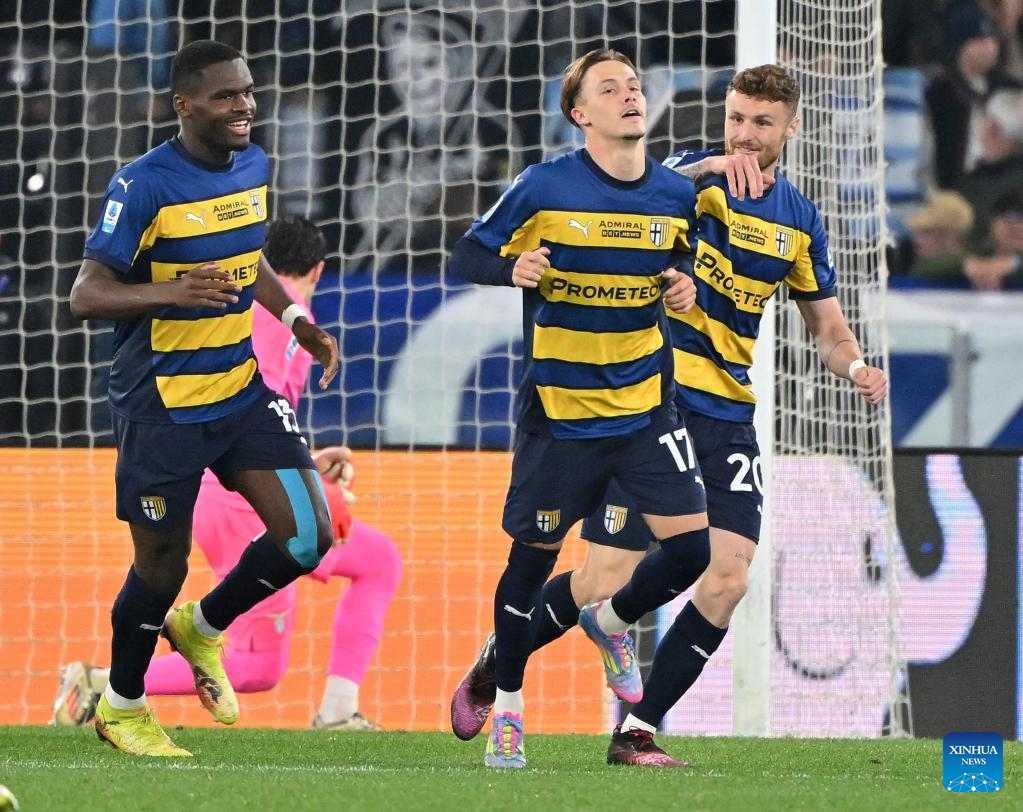 Parma's Jacob Ondrejka (1st L) celebrates his second goal during a Serie A soccer match between Lazio and Parma in Rome, Italy, April 28, 2025. (Photo by Alberto Lingria/Xinhua)