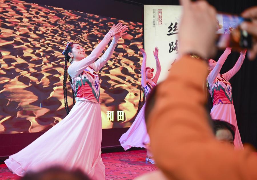 Nurbiye Jureait, along with more than ten colleagues, takes on performance duties, showcasing the rich and diverse cultural arts of Xinjiang through song and dance, while expressing admiration for the development and changes in Hotan.