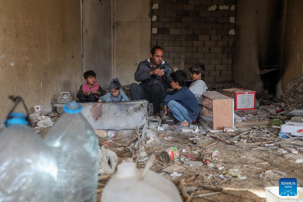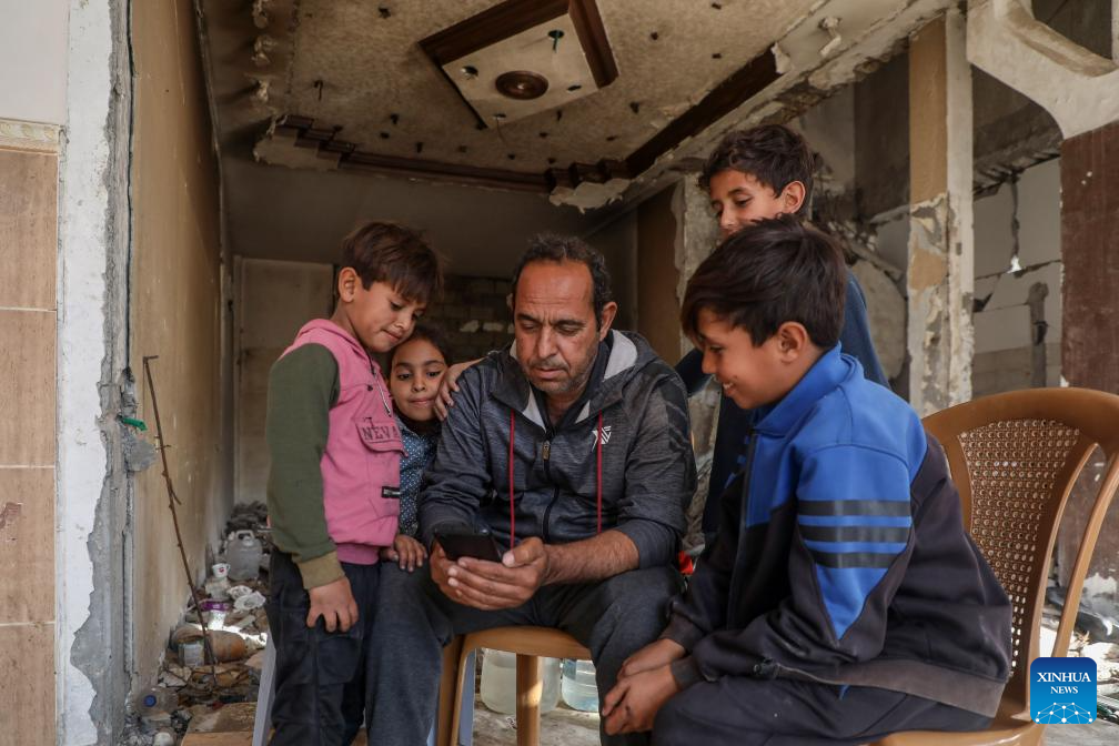 Akram Abu Khosa, a 49-year-old Palestinian farmer, and his children are seen at their damaged house in Tal al-Hawa, west of Gaza City, on April 28, 2025. In Tal al-Hawa, Akram Abu Khosa often sits quietly on his balcony. With his smartphone in hand, he scrolls through photos and videos of his once-vibrant strawberry fields. "Just two years ago, I would breathe the fresh air every morning amidst the fields. But now, I am forced to look at the devastation around me and remember my farm only through videos and photos," the father of six told Xinhua. (Photo by Rizek Abdeljawad/Xinhua)
