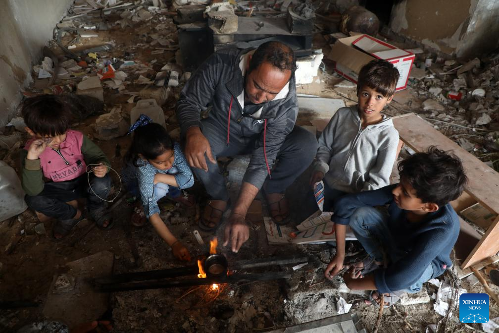 Akram Abu Khosa, a 49-year-old Palestinian farmer, and his children sit by a fire at their damaged house in Tal al-Hawa, west of Gaza City, on April 28, 2025. In Tal al-Hawa, Akram Abu Khosa often sits quietly on his balcony. With his smartphone in hand, he scrolls through photos and videos of his once-vibrant strawberry fields. "Just two years ago, I would breathe the fresh air every morning amidst the fields. But now, I am forced to look at the devastation around me and remember my farm only through videos and photos," the father of six told Xinhua. (Photo by Rizek Abdeljawad/Xinhua)