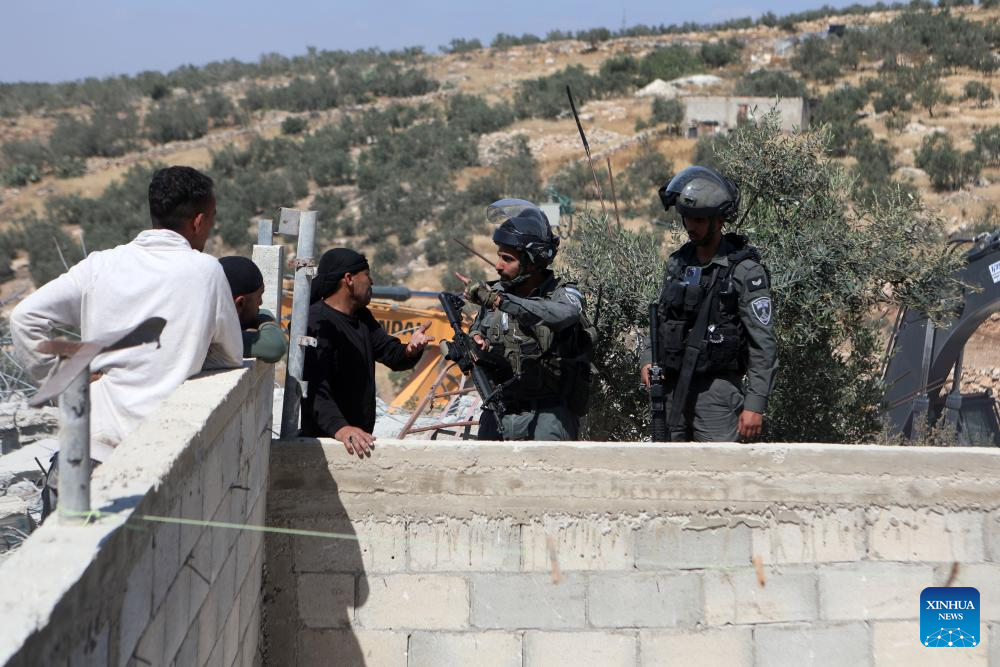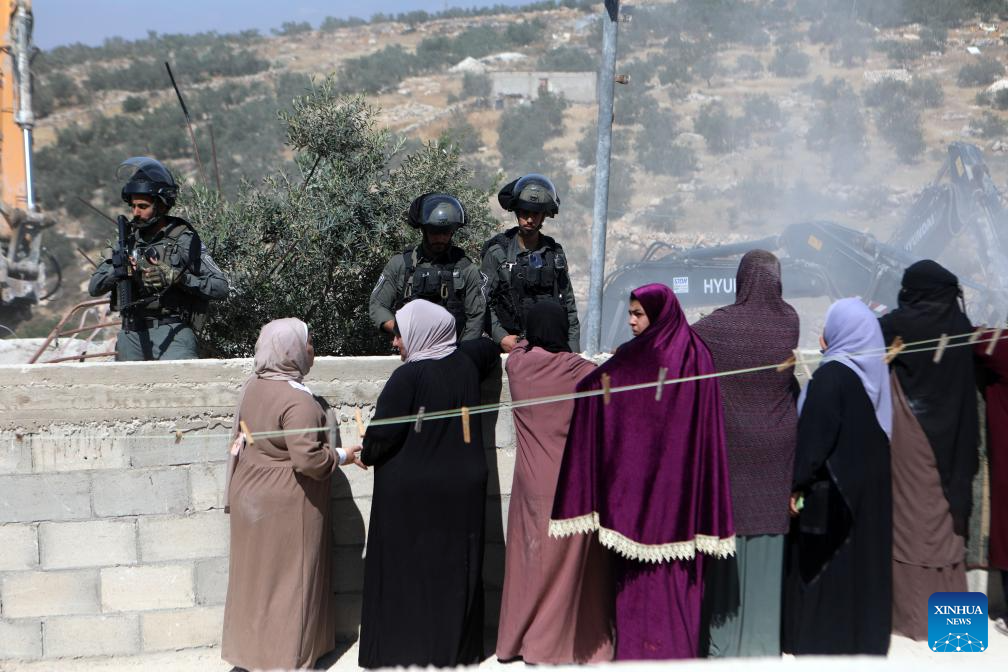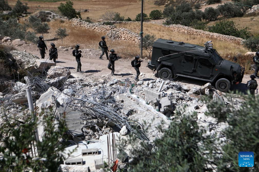 Israeli forces are seen after Israeli excavators demolish houses in the village of Idna, west of the West Bank city of Hebron, on April 28, 2025. The houses here were demolished due to a lack of Israeli-issue building permits, which Palestinians say are nearly impossible to obtain. (Photo by Mamoun Wazwaz/Xinhua)