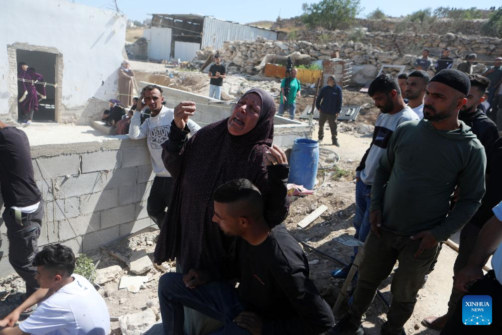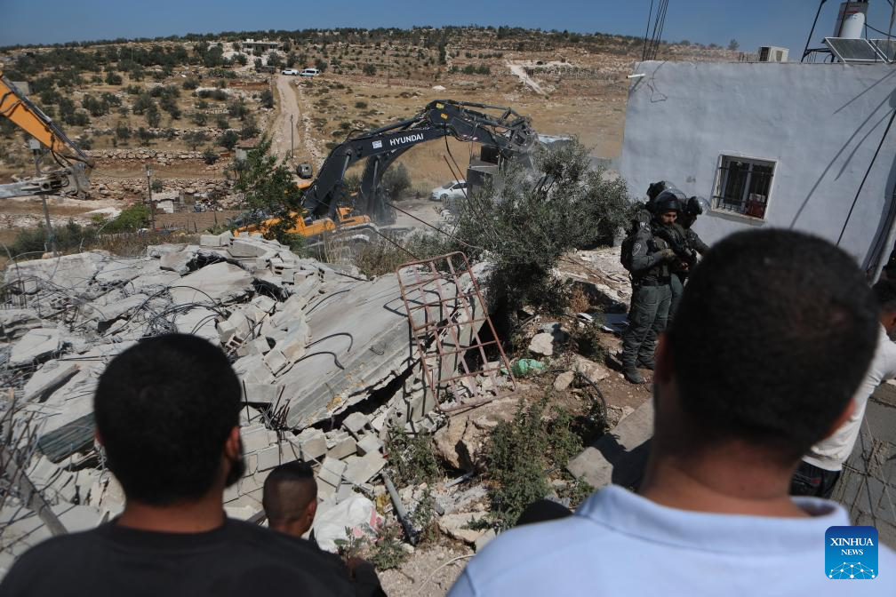 Palestinians are seen as Israeli excavators demolish a house in the village of Idna, west of the West Bank city of Hebron, on April 28, 2025. The houses here were demolished due to a lack of Israeli-issue building permits, which Palestinians say are nearly impossible to obtain. (Photo by Mamoun Wazwaz/Xinhua)