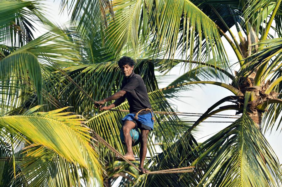 A worker cuts a coconut tree flower to collect sap in Negombo, about 30 km north of Colombo, Sri Lanka, April 26, 2025. (Photo by Ajith Perera/Xinhua)A worker walks on a rope between two coconut trees to collect tree sap in Negombo, about 30 km north of Colombo, Sri Lanka, April 26, 2025. (Photo by Ajith Perera/Xinhua)A worker climbs a coconut tree to collect tree sap in Negombo, about 30 km north of Colombo, Sri Lanka, April 26, 2025. (Photo by Ajith Perera/Xinhua)A worker pours coconut tree sap in Negombo, about 30 km north of Colombo, Sri Lanka, April 26, 2025. (Photo by Ajith Perera/Xinhua)■
