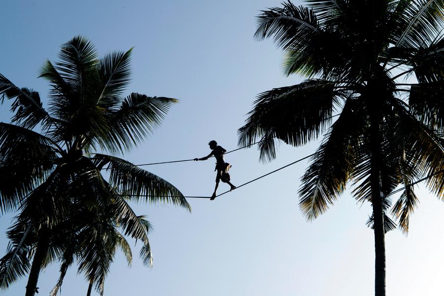 A worker walks on a rope between two coconut trees to collect tree sap in Negombo, about 30 km north of Colombo, Sri Lanka, April 26, 2025. (Photo by Ajith Perera/Xinhua)