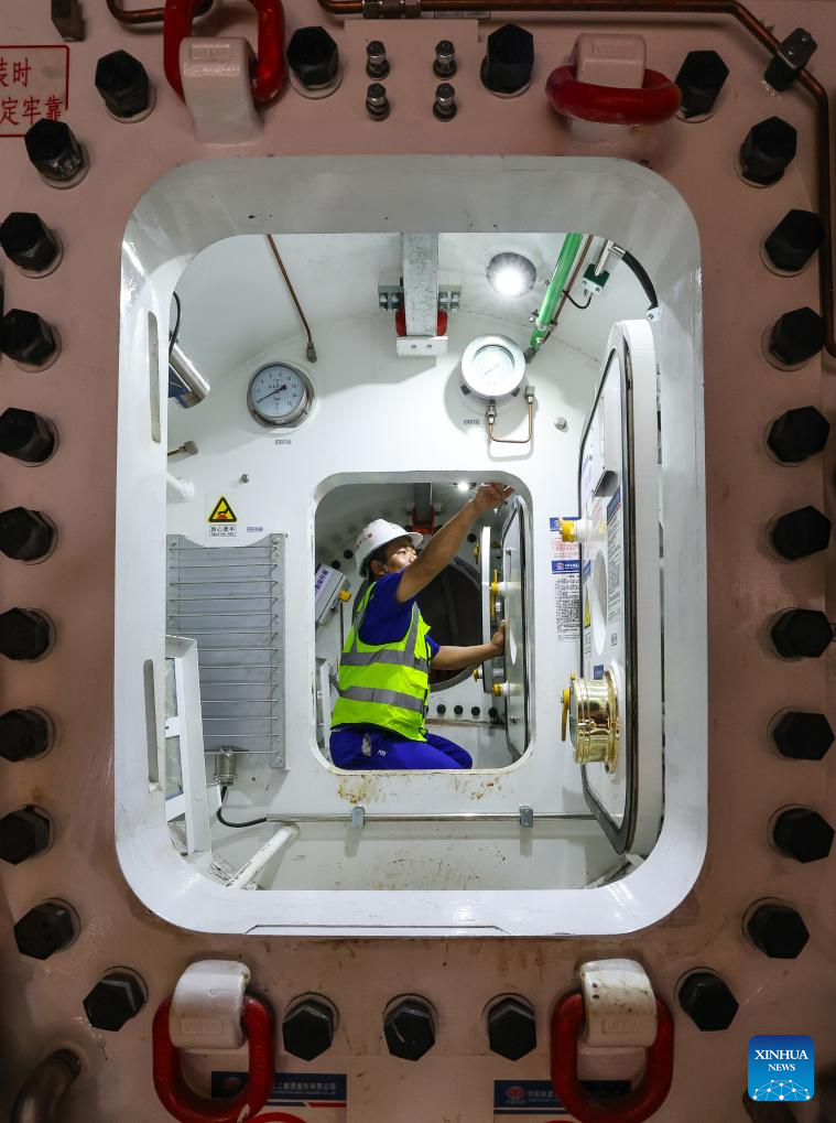 A technician conducts inspection before the starting of a giant shield tunneling machine at the construction site of a linking-up line connecting Guangzhou Railway Station and Guangzhou South Railway Station in Guangzhou, south China's Guangdong Province, April 28, 2025. The construction of the linking-up line connecting Guangzhou Railway Station and Guangzhou South Railway Station has recently been accelerated. The linking-up line will improve the transportation accessibility of the city after its completion. (Xinhua/Liu Dawei)