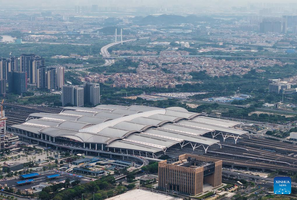 An aerial drone photo taken on April 28, 2025 shows the Guangzhou South Railway Station, which will be linked via a linking-up line with Guangzhou Railway Station in Guangzhou, south China's Guangdong Province. The construction of the linking-up line connecting Guangzhou Railway Station and Guangzhou South Railway Station has recently been accelerated. The linking-up line will improve the transportation accessibility of the city after its completion. (Xinhua/Liu Dawei)