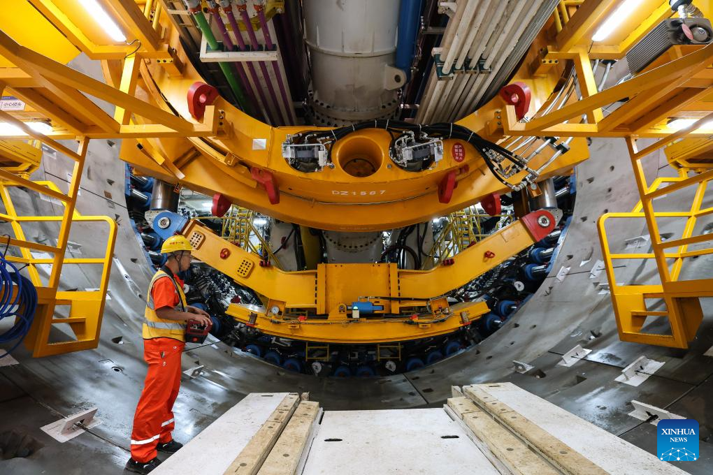 A staff member operates a giant shield tunneling machine at the construction site of a linking-up line connecting Guangzhou Railway Station and Guangzhou South Railway Station in Guangzhou, south China's Guangdong Province, April 28, 2025. The construction of the linking-up line connecting Guangzhou Railway Station and Guangzhou South Railway Station has recently been accelerated. The linking-up line will improve the transportation accessibility of the city after its completion. (Xinhua/Liu Dawei)