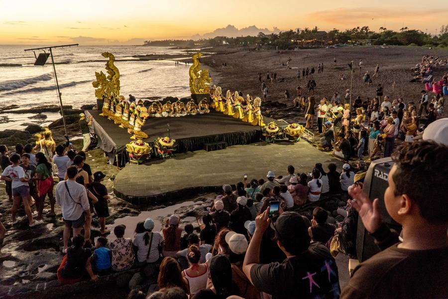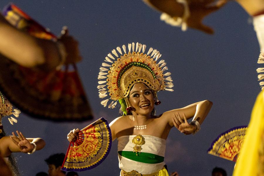 Artists perform the traditional Balinese Janger dance to celebrate International Dance Day at Pererenan Beach in Badung Regency, Bali, Indonesia, April 29, 2025. (Dicky Bisinglasi/Xinhua)