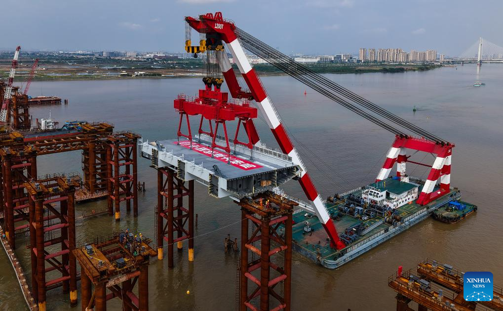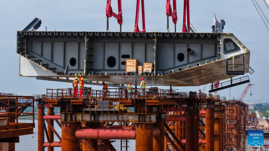 This photo taken on April 29, 2025 shows the setting scene of the first steel box girder of Wanlong Grand Bridge in Nansha District of Guangzhou, south China's Guangdong Province. The first steel box girder of Wanlong Grand Bridge, with a length of 5,146 meters, a main bridge of 1,150 meters and a main span of 608 meters, was successfully set on Tuesday. The bridge, located at Guangdong-Hong Kong-Macao Greater Bay Area, is the world's largest-span self-anchored suspension bridge. (Xinhua/Liu Dawei)