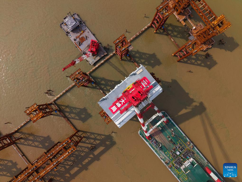 An aerial drone photo taken on April 29, 2025 shows the setting scene of the first steel box girder of Wanlong Grand Bridge in Nansha District of Guangzhou, south China's Guangdong Province. The first steel box girder of Wanlong Grand Bridge, with a length of 5,146 meters, a main bridge of 1,150 meters and a main span of 608 meters, was successfully set on Tuesday. The bridge, located at Guangdong-Hong Kong-Macao Greater Bay Area, is the world's largest-span self-anchored suspension bridge. (Xinhua/Liu Dawei)