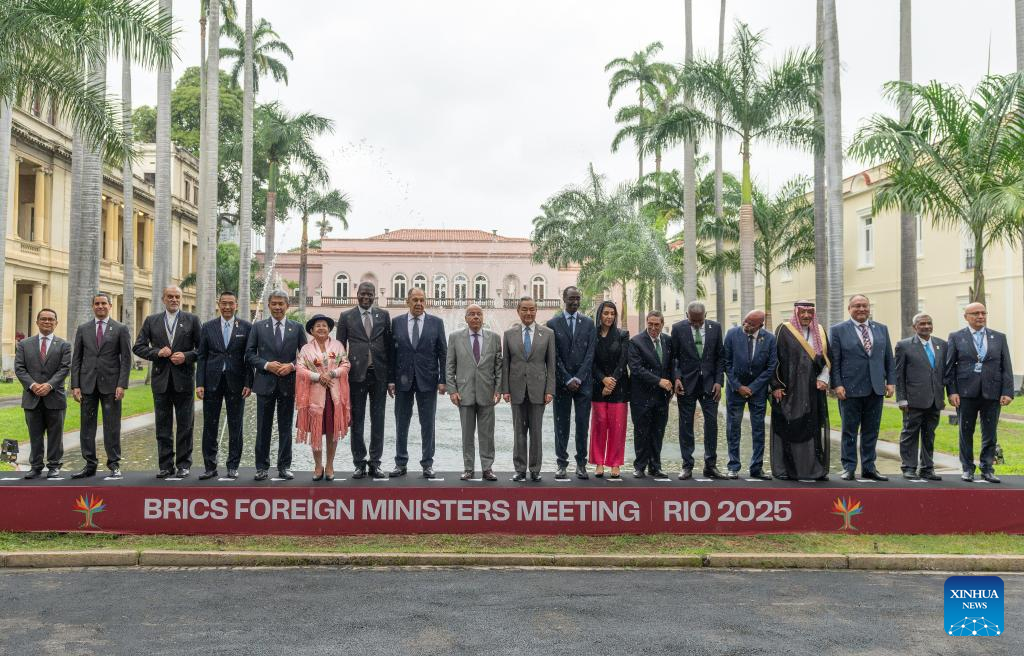 Chinese Foreign Minister Wang Yi, also a member of the Political Bureau of the Communist Party of China Central Committee, poses for a group photo with other participants of a meeting of foreign ministers from the BRICS members and partner countries in Rio de Janeiro, Brazil, April 29, 2025. Brazilian Minister of Foreign Affairs Mauro Vieira chaired the meeting. (Xinhua/Wang Tiancong)