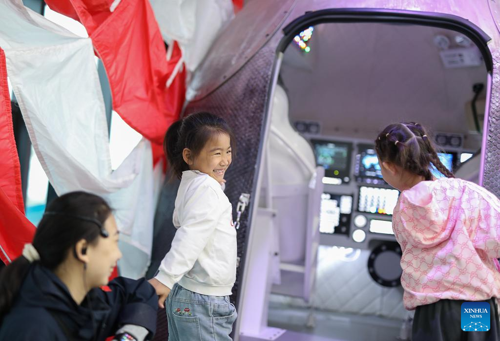 Kids visit a space station model at an aerospace science popularization base in a satellite manufacturing industrial park in Hebi, central China's Henan Province, April 21, 2025.(Xinhua/Li Jianan)