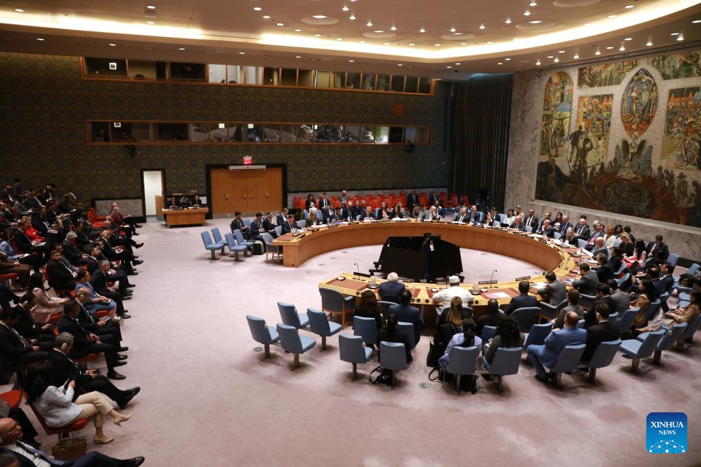 This photo taken on April 29, 2025 shows a scene during the UN Security Council open debate on the situation in the Middle East, at the UN headquarters in New York. UN Secretary-General Antonio Guterres warned on Tuesday that the two-State solution to the Palestinian question "is near a point of no return." (Xinhua/Xie E)