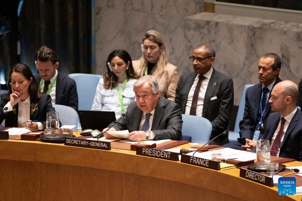 UN Secretary-General Antonio Guterres speaks during the UN Security Council open debate on the situation in the Middle East, at the UN headquarters in New York, April 29, 2025. Guterres warned on Tuesday that the two-State solution to the Palestinian question "is near a point of no return." (Xinhua/Xie E)