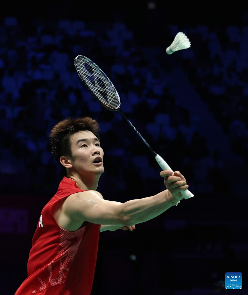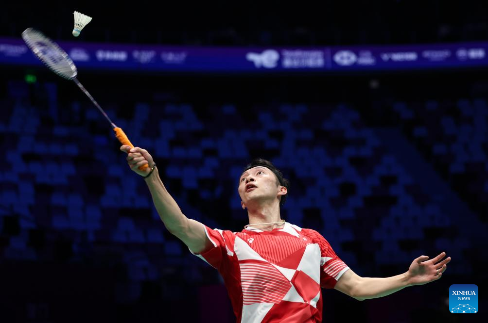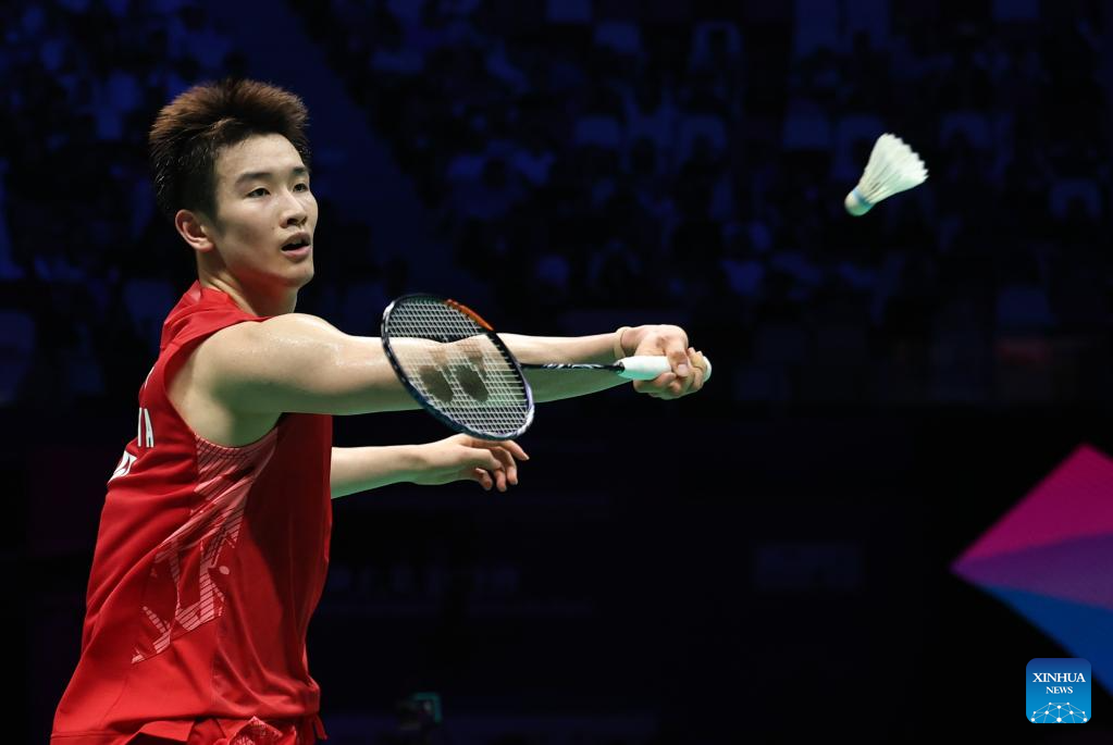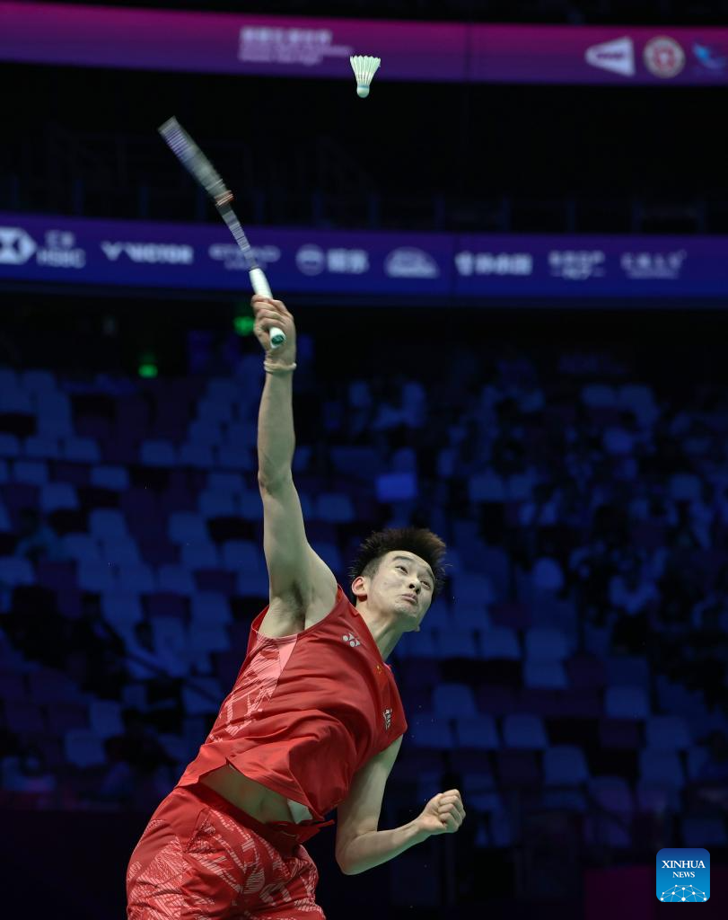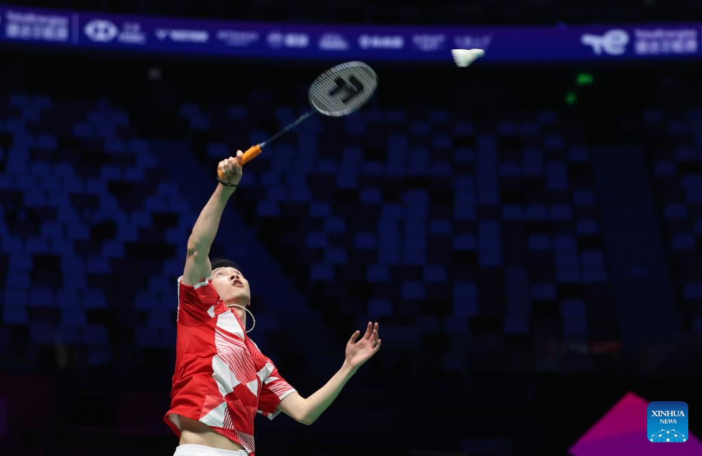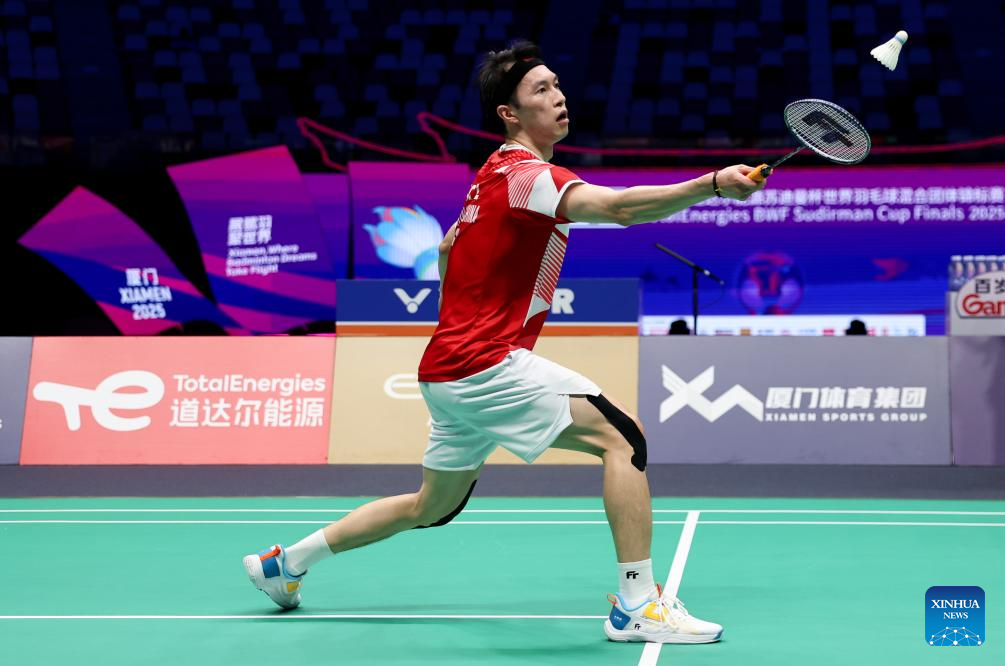 Li Shifeng of China competes in the men's singles match against Kantaphon Wangcharoen of Thailand during the Group A match between China and Thailand at BWF Sudirman Cup in Xiamen, southeast China's Fujian Province, April 30, 2025. (Xinhua/Wei Peiquan)