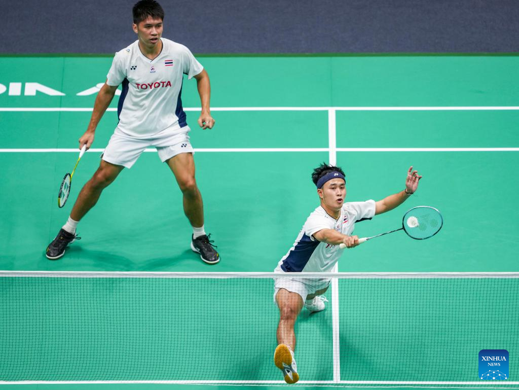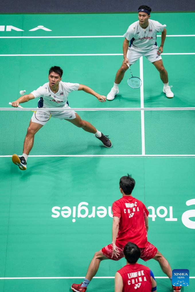 Supak Jomkoh (L)/Kittinupong Kedren of Thailand compete in the men's doubles match against Liang Weikeng/Wang Chang of China during the Group A match between China and Thailand at BWF Sudirman Cup in Xiamen, southeast China's Fujian Province, April 30, 2025. (Xinhua/Wang Kaiyan)