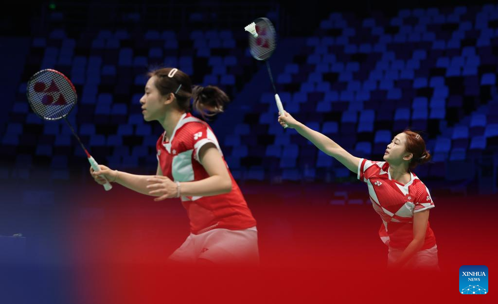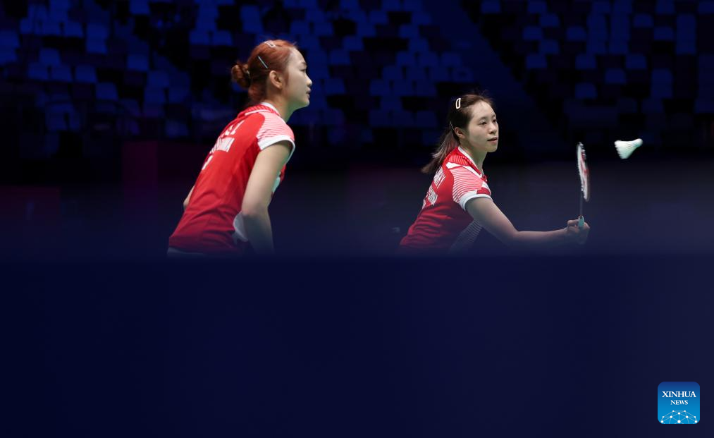 Lui Lok Lok (R)/Tsang Hiu Yan compete in the women's doubles match between Lui Lok Lok/Tsang Hiu Yan of China's Hongkong and Yasmina Chibah/Linda Mazri of Algeria during the group A match between China's Hongkong and Algeria at BWF Sudirman Cup in Xiamen, southeast China's Fujian Province, April 30, 2025. (Xinhua/Wang Kaiyan)