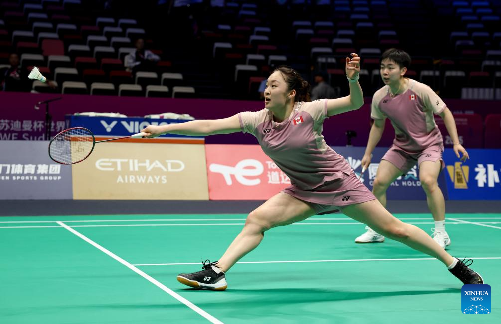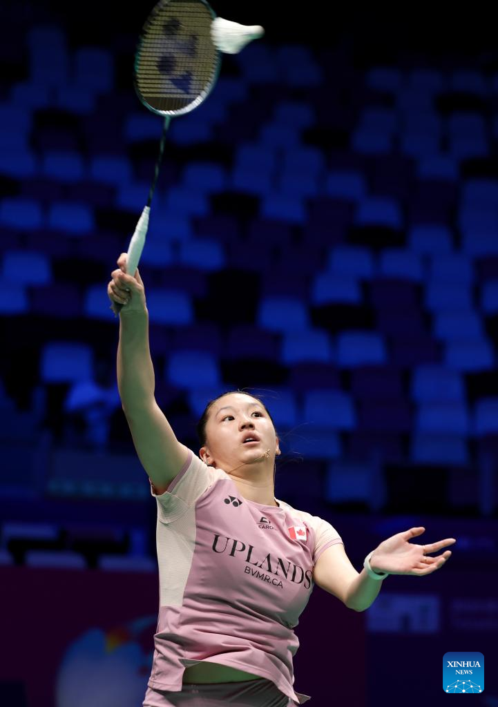 Zhang Wen Yu of Canada competes in the women's singles match against Petra Maixnerova of the Czech Republic during the group B match between Canada and the Czech Republic at BWF Sudirman Cup in Xiamen, southeast China's Fujian Province, April 30, 2025. (Xinhua/Wang Kaiyan)