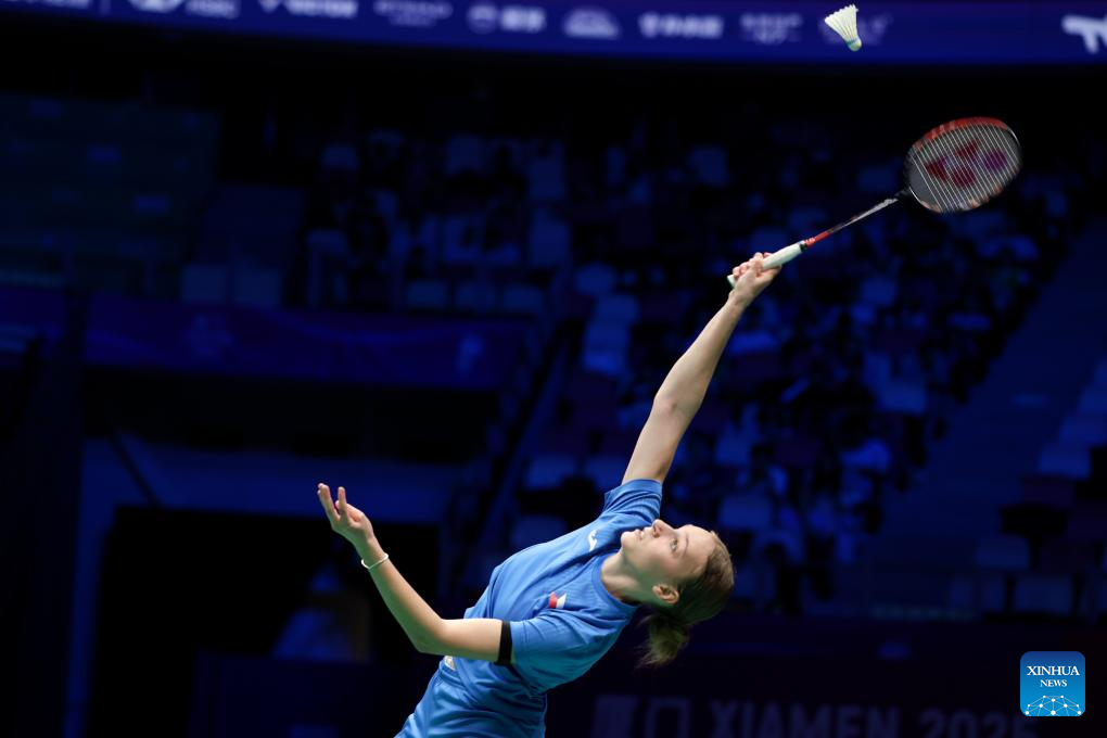 Petra Maixnerova of the Czech Republic competes in the women's singles match against Zhang Wen Yu of Canada during the group B match between Canada and the Czech Republic at BWF Sudirman Cup in Xiamen, southeast China's Fujian Province, April 30, 2025. (Xinhua/Wang Kaiyan)
